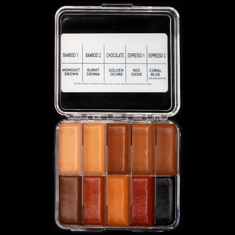 The On Set Dark Fleshtone Palette is a mini version of the classic size Skin Illustrator Dark Fleshtone palette. The Dark Fleshtone palette colors include: Bamboo 1, Bamboo 2, Chocolate, Espresso 1, Espresso 2, Midnight Brown, Burnt Sienna, Golden Ochre, Red Oxide and Coral Blue.