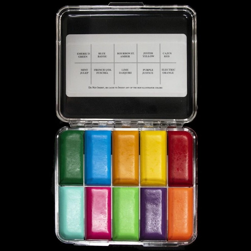 The Skin Illustrator On Set Mardi Gras Palette is a mini version of the classic size Skin Illustrator Mardi Gras palette. This compact, pocket size palette contains the full ten colors of the larger Mardi Gras palette, making touch ups fast and easy. This palette is a must for any makeup FX artist.