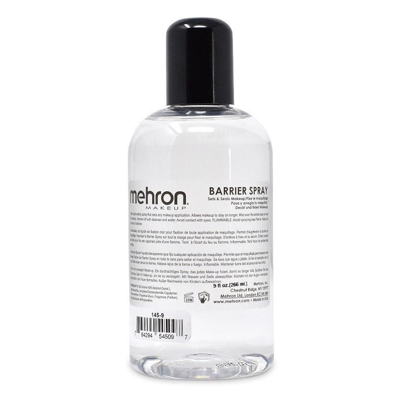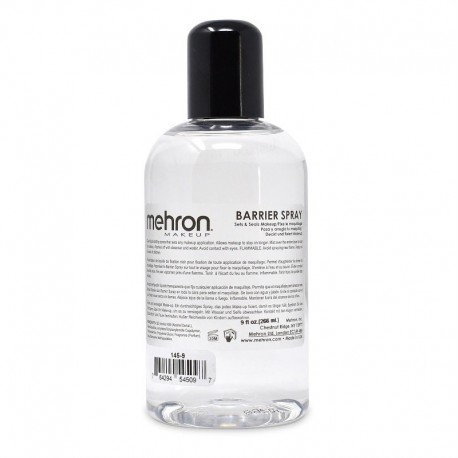 Mehron Barrier Spray is a clear liquid setting spray that sets makeup designs and can protect sensitive skin from makeup, latex and other adhesives. Great for all Modeling, TV, Stage, Clowning, Face Painting, Halloween, Special Effects and Photography makeup applications.