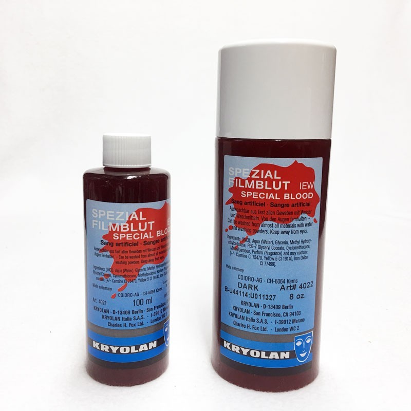 Special Blood IEW manufactured by Kryolan Professional Makeup is a multi-purpose version of artificial blood for theater, film, and television. This artificial blood product can be washed out of virtually all textiles and articles of clothing. It is also suitable for use in and around the mouth.