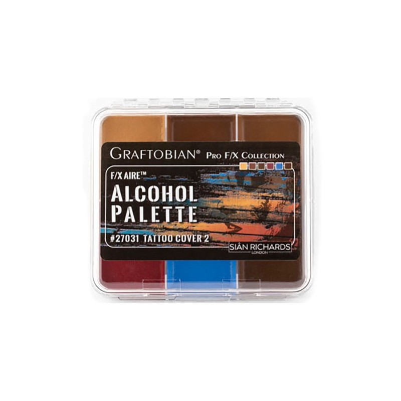 Graftobian's NEW F/X Aire™ Alcohol Palettes were formulated to simulate bruises, contusions, wounds, wrinkles, and other ghastly creations. The Tattoo Cover 2 palette colors include Buttermilk, Natural Tan, Milk Chocolate, Soft Cherry Blush, Teal, and Special Dark.