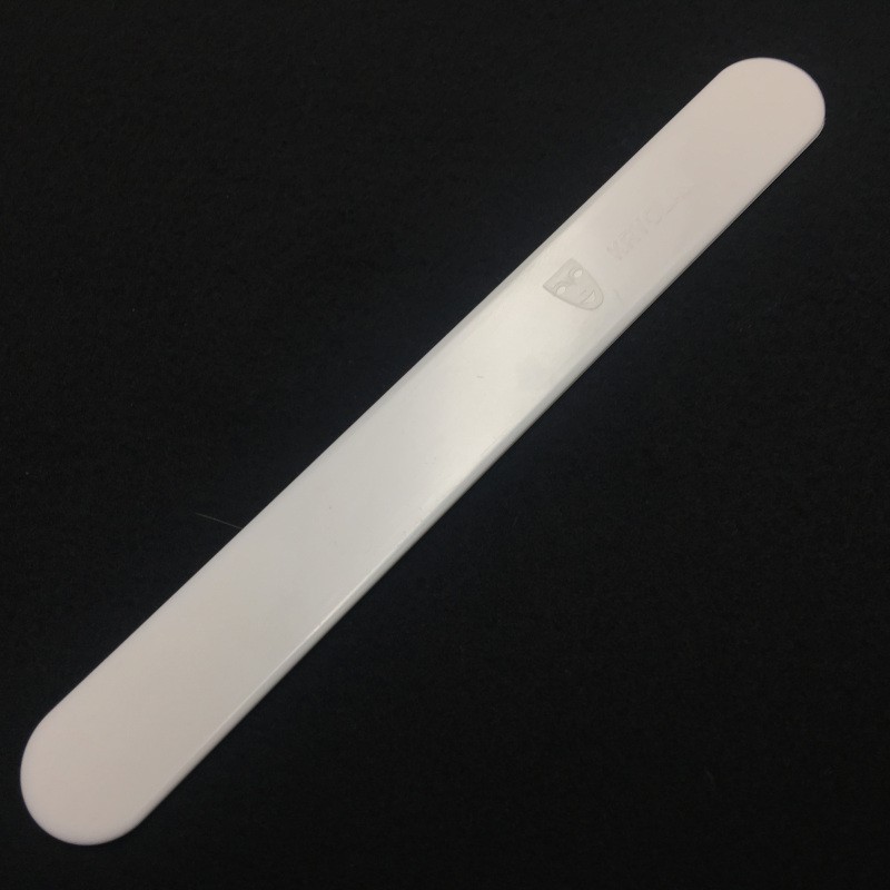 The Kryolan Mixing Spatula is a flexible white plastic spatula about the size and shape of a standard wooden tongue depressor. It is 11/16-inch wide and the overall length of this mixing spatula is approximately 5 27/32-inches. The Kryolan logo is embossed on one side. Easily wipes clean for use again and again.
